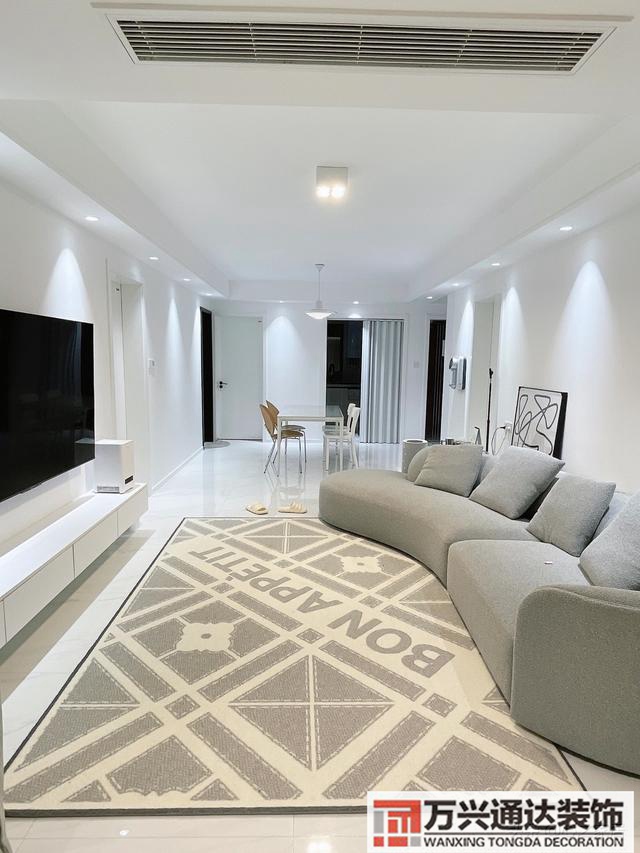 客廳一氣呵成做了雙眼吊頂,客廳沒有安裝主燈,而是明裝7W 3000k的筒燈,照明效果完全夠用,電視背景墻3m,選擇了2.6m的壁掛式的電視柜,簡約實用,所有線路都走了墻里,所以表面很規(guī)整,75寸大電視上墻,電視是要大,小了看著不舒服,也會顯得墻面太空。客廳區(qū)域鋪設了地毯,選擇了一款超大的不規(guī)則沙發(fā),坐上去真是特別舒服。