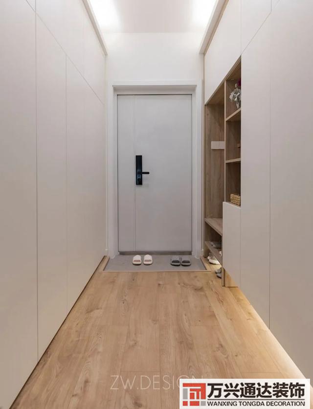 ▲玄關(guān)兩側(cè)都裝上收納柜,一邊是儲(chǔ)物柜、一邊是鞋柜+換鞋凳組合,鞋柜底部做了留空與燈帶設(shè)計(jì),常穿的鞋柜可以方便地放在這里,在鞋柜里加入換鞋凳與空格架設(shè)計(jì),也為主人提供了方便的使用體驗(yàn)。